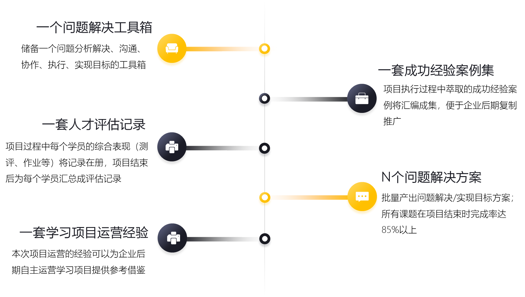 本項目融合了行動學(xué)習(xí)、引導(dǎo)技術(shù)、案例情景、模擬訓(xùn)練等核心元素和工具,并注重訓(xùn)前后調(diào)研,訓(xùn)中跟進,訓(xùn)后優(yōu)化行為,從而達到優(yōu)化思維、解決問題,改善績效,同時提升能力的培訓(xùn)目的!