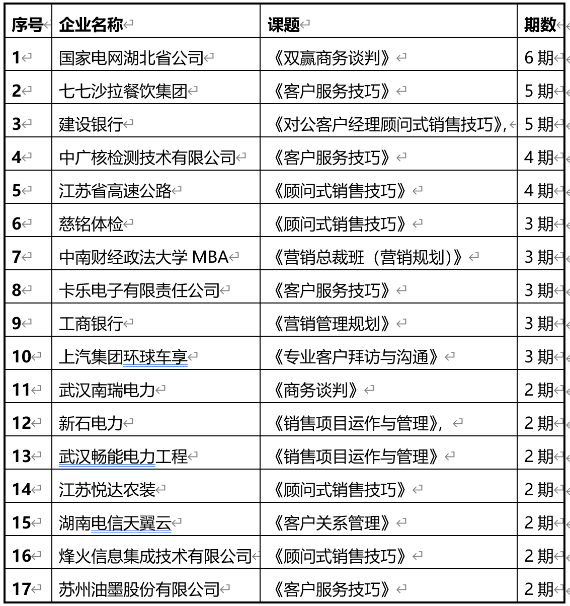 近期部分授課案例: